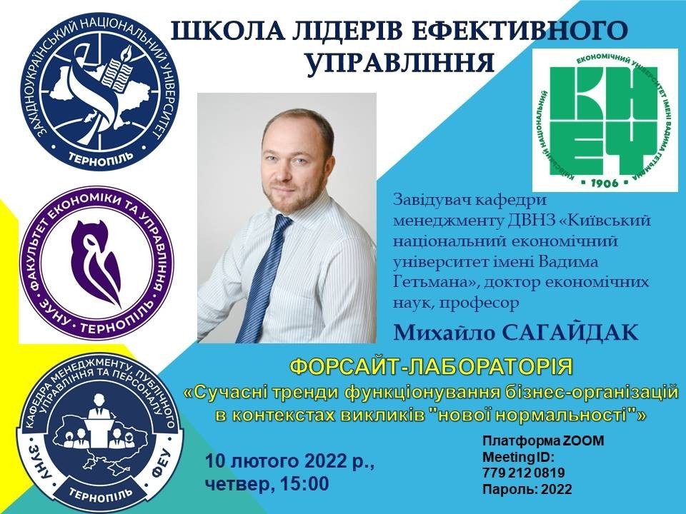 10 лютого 2022 року у рамках проєкту «Школа лідерів ефективного управління», запровадженого кафедрою менеджменту, публічного управління та персоналу Західноукраїнського національного університету, відбулася форсайт-лабораторія «Сучасні тренди функціонування бізнес-організацій в контекстах викликів “нової нормальності”». Модератором цього заходу виступив завідувач кафедри менеджменту ДВНЗ «Київський національний економічний університет імені Вадима Гетьмана», доктор економічних наук, професор Михайло САГАЙДАК.