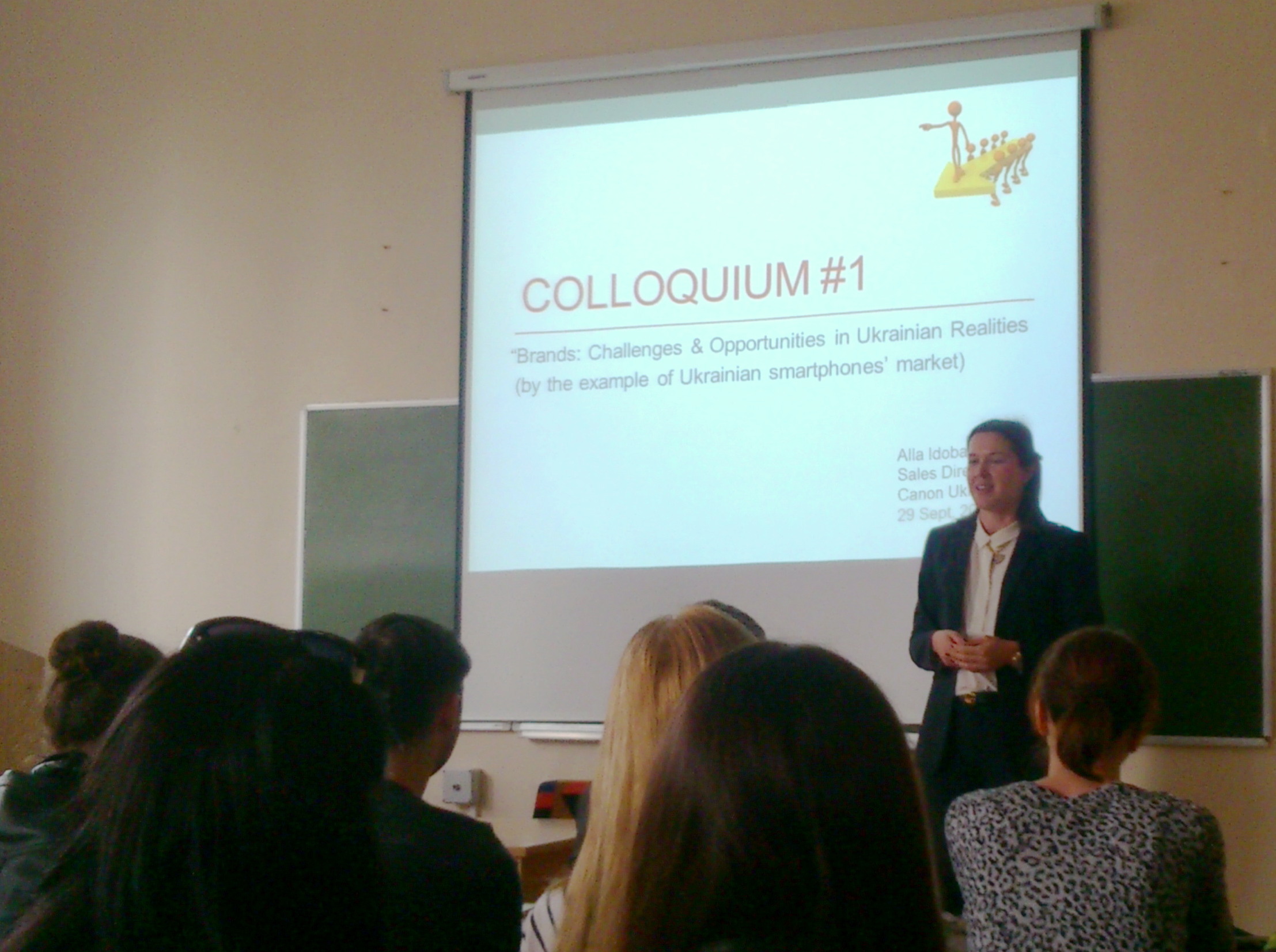 Перше засідання англомовного Економічного колоквіуму відбулося!29 Вересня 2014р.![]() 29 вересня 2014 року на факультеті економіки та управління КНЕУ відбулось перше засідання англомовного Економічного колоквіуму. Студенти 3-5 курсів та викладачі кафедри стратегії підприємств поцінували яскраву лекцію Алли Ідобаєвої, директора з продажів компанії Canon Ukraine, та активно залучились до дискусії з теми "Brands: challenges and opportunities in Ukrainian realities (on the bases of Ukrainian mobile phones market)". Зустріч була наповнена цікавою та актуальною інформацією про розвиток брендування сегменту смартфонів в українських реаліях. В ході колоквіуму студенти змогли отримати практичні навички, беручи участь у груповій роботі, вирішуючи поставлені проблеми і практикуючі власну брендинг-презентацію. Фото і відео ви можете завантажити з нашого альбому :) Багато питань, занурення в роботу, жвавай інтерес, динаміка ... от, що ми можемо сказати про цю дивовижну зустріч. Відмінний початок нашого економічного колоквіуму! Наступне засідання Економічного колоквіуму відбудеться 6 жовтня 2014 року. З нами буде Ольга Галушко, "Wyse&Company Limited”, “GO! Management School”з темою "Developing Your Strategy of Success: From Nice Student to Great Manager". On the September 29, 2014 the first meeting of the Economic Colloquium was held. Students of the 3d-5th courses and our faculty appreciated Alla Idobayeva (Director of Sales Canon Ukraine) for her fascinating lecture of Brands: challenges and opportunities in Ukrainian realities (on the bases of Ukrainian mobile phones market) and actively discussed it. Our meeting was filled with interesting and relevant information about the development of smartphones segment branding in the Ukrainian realities. During the colloquium, students were able to gain experience by participating in-group work, solving cases and practicing self-branding presentation. Many questions, full involvement, vivid interest, dynamics ... that’s what we can say about this amazing meeting in a nutshell. Great start of our Economic Colloquium! You can download photos and videos from our album :) See you next time on the October 6th, 2014. Our speaker will be Olga Galushko, Wyse & Company Limited "," GO! Management School "with the topic of Developing Your Strategy of Success: From Nice Student to Great Manager. |