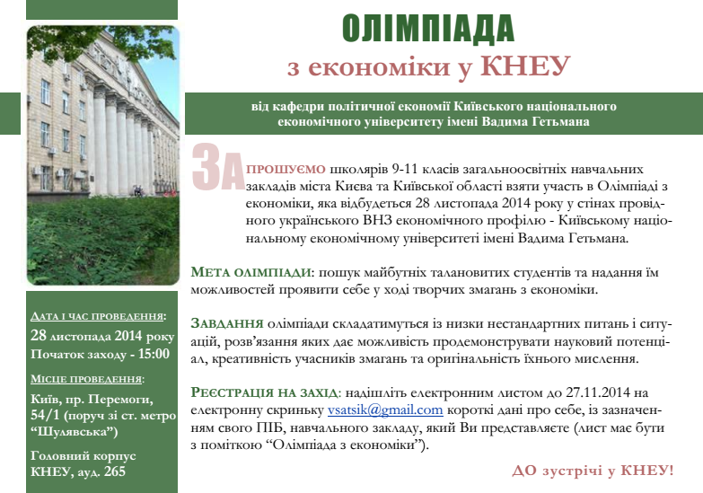 ЗАПРОШУЄМО школярів 9-11 класів загальноосвітніх навчальних закладів міста Києва та Київської області взяти участь в Олімпіаді з економіки, яка відбудеться 28 листопада 2014 року у стінах провідного українського ВНЗ економічного профілю -