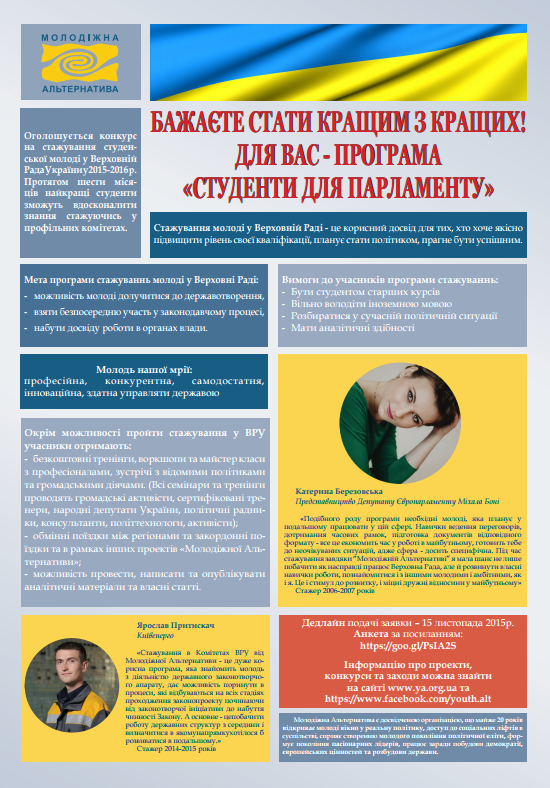 Запрошуємо на презентацію грандіозного проекту «Студенти для Парламенту», який впродовж 20 років реалізовує ГО «Молодіжна Альтернатива».