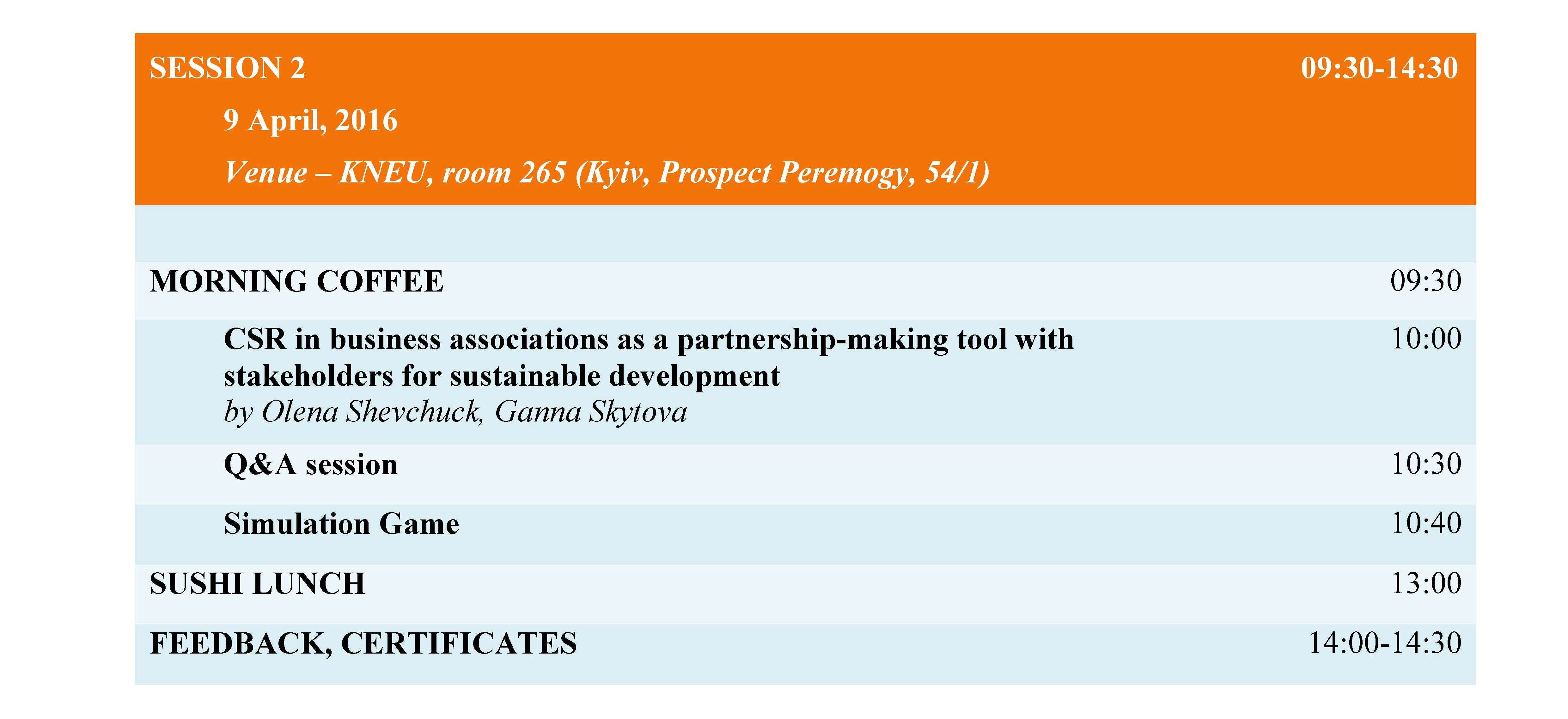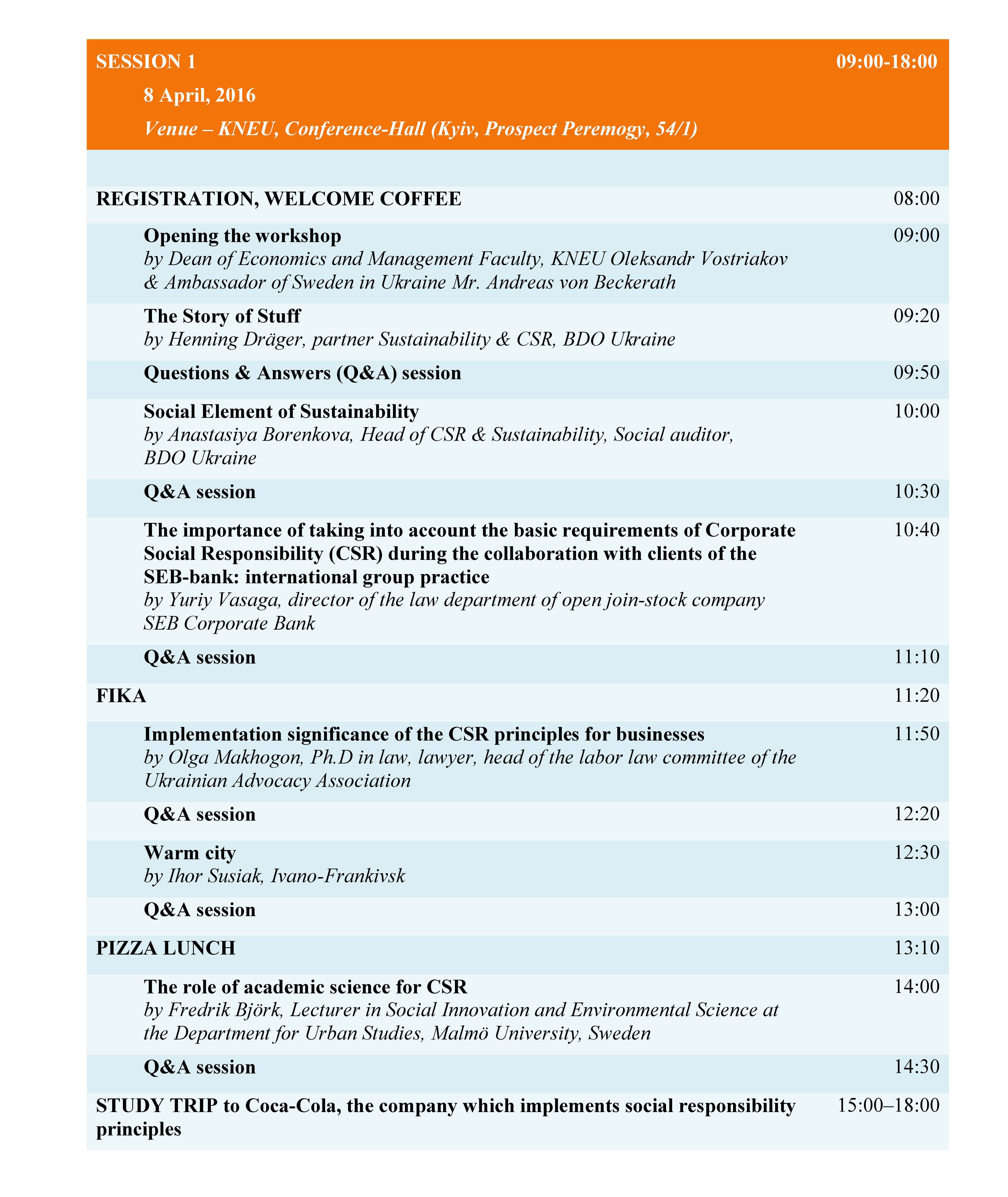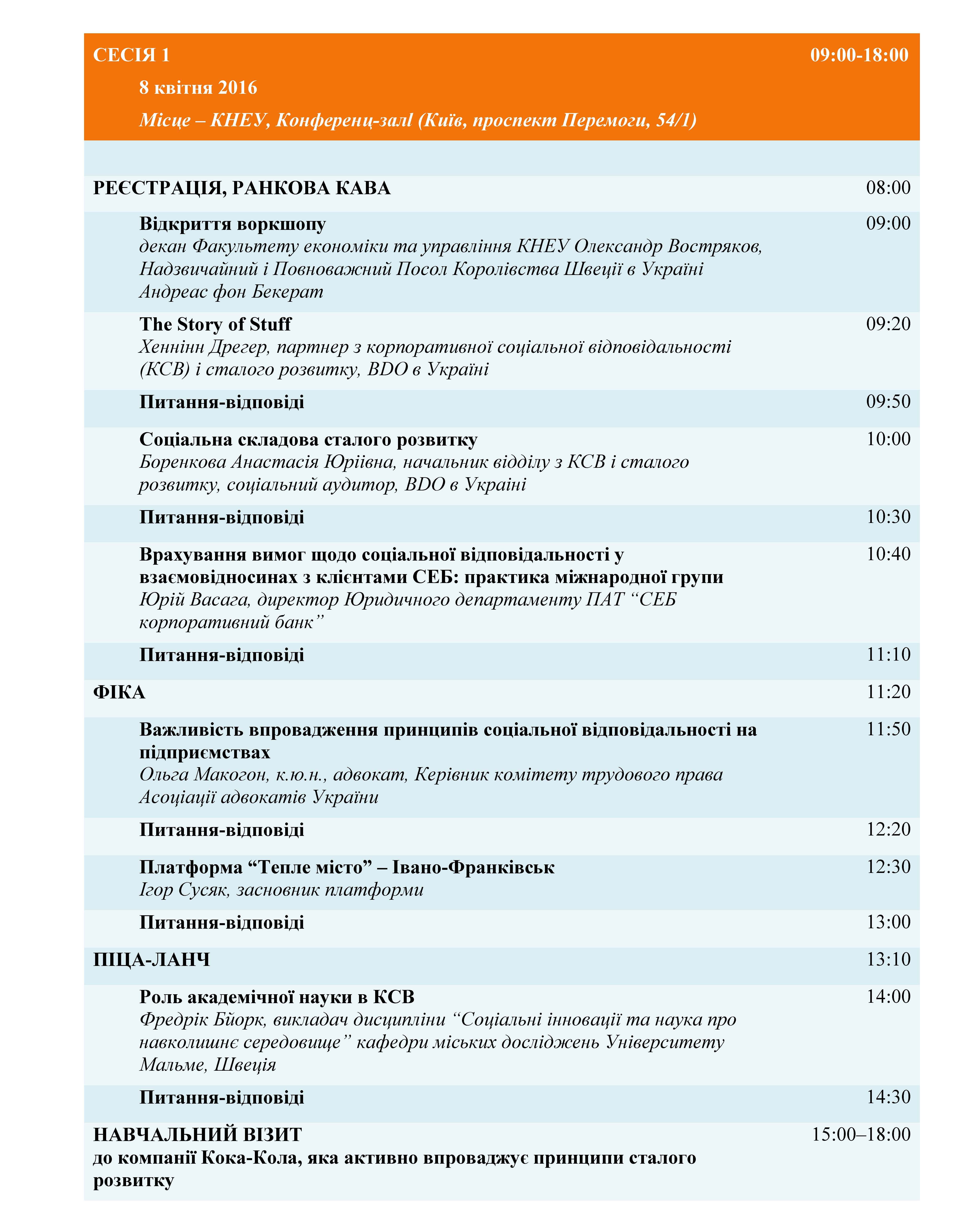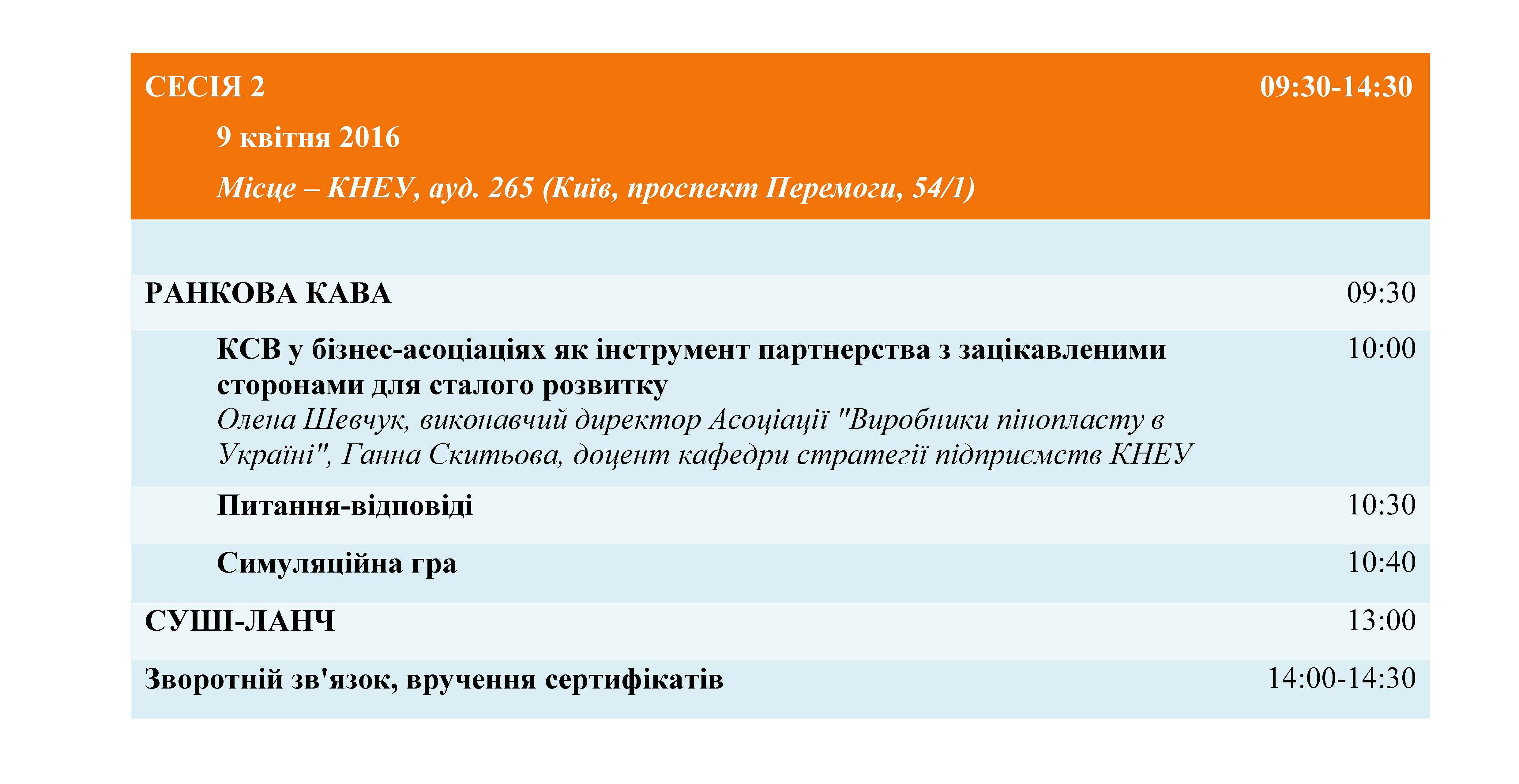 Запрошуємо на воркшоп «Cоціальна відповідальність для сталого розвитку»15 Березня 2016р.8-9 квітня 2016 року у конференц-залі ДВНЗ «КНЕУ імені Вадима Гетьмана» за грантової підтримки Шведського Інституту (SI) та інформаційної підтримки Посольства Швеції в Україні відбудеться Інтелектуальний воркшоп «Соціальна відповідальність для сталого розвитку». Організаторами заходу є Київський національний економічний університет ім.В.Гетьмана (факультет економіки та управління) та громадська організація «Поруч», науково-популярний сайт «Освітні тренди». Партнером виступає ТМ «Askold». Основною метою проведення заходу є ознайомлення учасників з теоретичними основами та практичним досвідом питань соціальної відповідальності та стимулювання розвитку бачення ефективних стратегій соціальної відповідальності як невід’ємної складової сталого розвитку. Дводенний воркшоп буде поєднувати теоретичні та практичні види активності, включати групову та індивідуальну роботу учасників, інтерактивні дискусії. Програма заходу включає лекції експертів, методику «живої бібліотеки», гру-симуляцію та навчальну поїздку на підприємство «Оболонь», що впроваджує принципи соціальної відповідальності у своїй діяльності. До участі у воркшопі запрошуються: випускники Шведського Інституту, науковці, викладачі, аспіранти, студенти, представники громадського сектору, підприємці, фахівці, зайняті у сфері сталого розвитку та соціального підприємництва та всі зацікавлені даною тематикою. Робоча мова заходу – українська, англійська. Участь у заході є безкоштовною. Всі учасники отримають відповідні Сертифікати участі. Для того, щоб взяти участь, необхідно зареєструватися за https://docs.google.com/forms/d/1RS3qrnjicUKNnr48xXhlFpxYiaJGocgGeRReLMlaONw/viewform