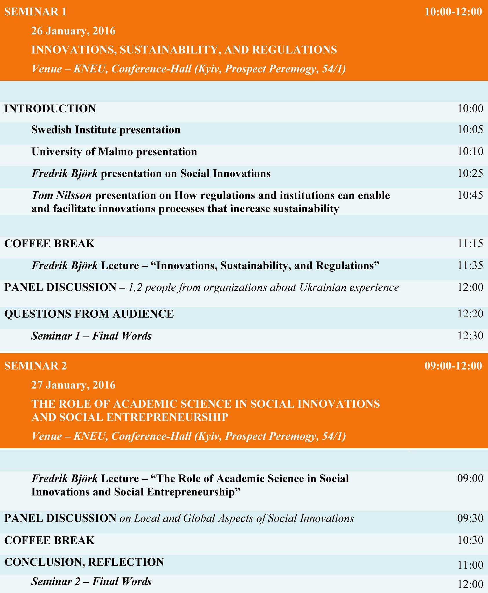 If you intend to participate in the event, please, send a short message to vsatsik@gmail.com (Сацик Володимир). Arguably, ’sustainability’ is today one of the most important concepts in international politics. The Sustainable Development Goals (SDGs) that are supposed to guide national as well as international policy for the coming years are just one example of this. The challenges - social as well as environmental - are enormous. At the same time, ’innovation’ has evolved as an important strategy to create a more sustainable world. The topic of today’s seminar is how regulations and institutions can enable and facilitate innovations processes that increase sustainability. January 27: “The Role of Academic Science in Social Innovations and Social Entrepreneurship” During the last 15 years, the interest in social entrepreneurship and social innovation as strategies to meet challenges in society has grown continuously all over the world. The drivers of this process has largely been social entrepreneurs themselves, but Universities were quick to pick up on this. Today, there is an abundance of research and development projects, courses and programs on different levels as well as different institutional arrangements, such as incubators and knowledge centers. It can be argued that this can be seen as an example of Universities pushing beyond traditional roles of teaching and research towards taking a more active role in society, especially building on cross-sector collaborations.