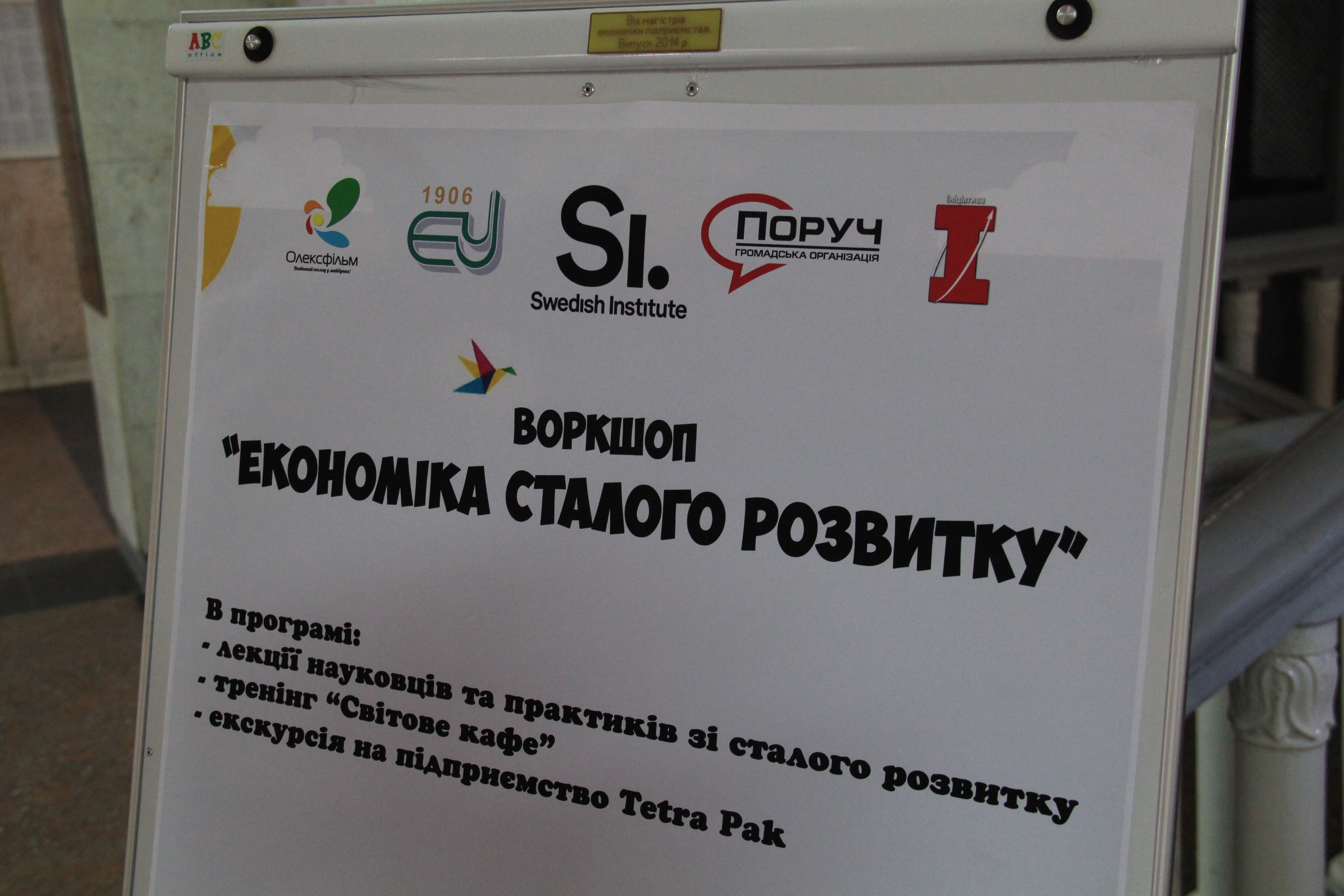 Програма заходу передбачала цикл коротких лекцій від фахівців та експертів, які стосувалися сучасної методології сталого розвитку (старший викладач КНЕУ Арсен Келічавий), сучасних ролі та місця університетів у просуванні ідеї сталості (доцент КНЕУ Володимир Сацик) та перспектив розбудови сонячної енергетики в Україні (менеджер компанії “Магнус” Денис Хоменко). Програма першого дня воркшопу була доповнена ознайомчою поїздкою учасників до всесвітньо відомої шведської компанії Tetra Pak, яка спеціалізується на переробці та виробництві упаковки для продуктів харчування, виробничі потужності якої розміщені у м. Києві. У ході екскурсії начальник зміни Віталій Сичевський з особливим захопленням розповів відвідувачам про історію компанії, основні виробничі процеси виготовлення упаковки за шведськими технологіями, бізнес-структуру підприємства та його перспективи на майбутнє, у тому числі в екологічній сфері.